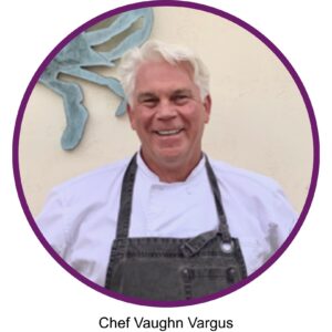 Chef Vaughn, also a San Diego native, grew up in the food industry, starting in restaurants as a teenager. He says he was fortunate to learn under chefs in local kitchens who helped him grow early in his career, before he went on to expand into large-scale hospitality and food service operations, where he developed the skills to lead multiple operations with diverse menus. Now Senior Executive Chef for UC San Diego’s dining division, he oversees culinary operations, serving 40,000 students with the help of 900 culinary employees across 16 kitchens and multiple rolling menus.